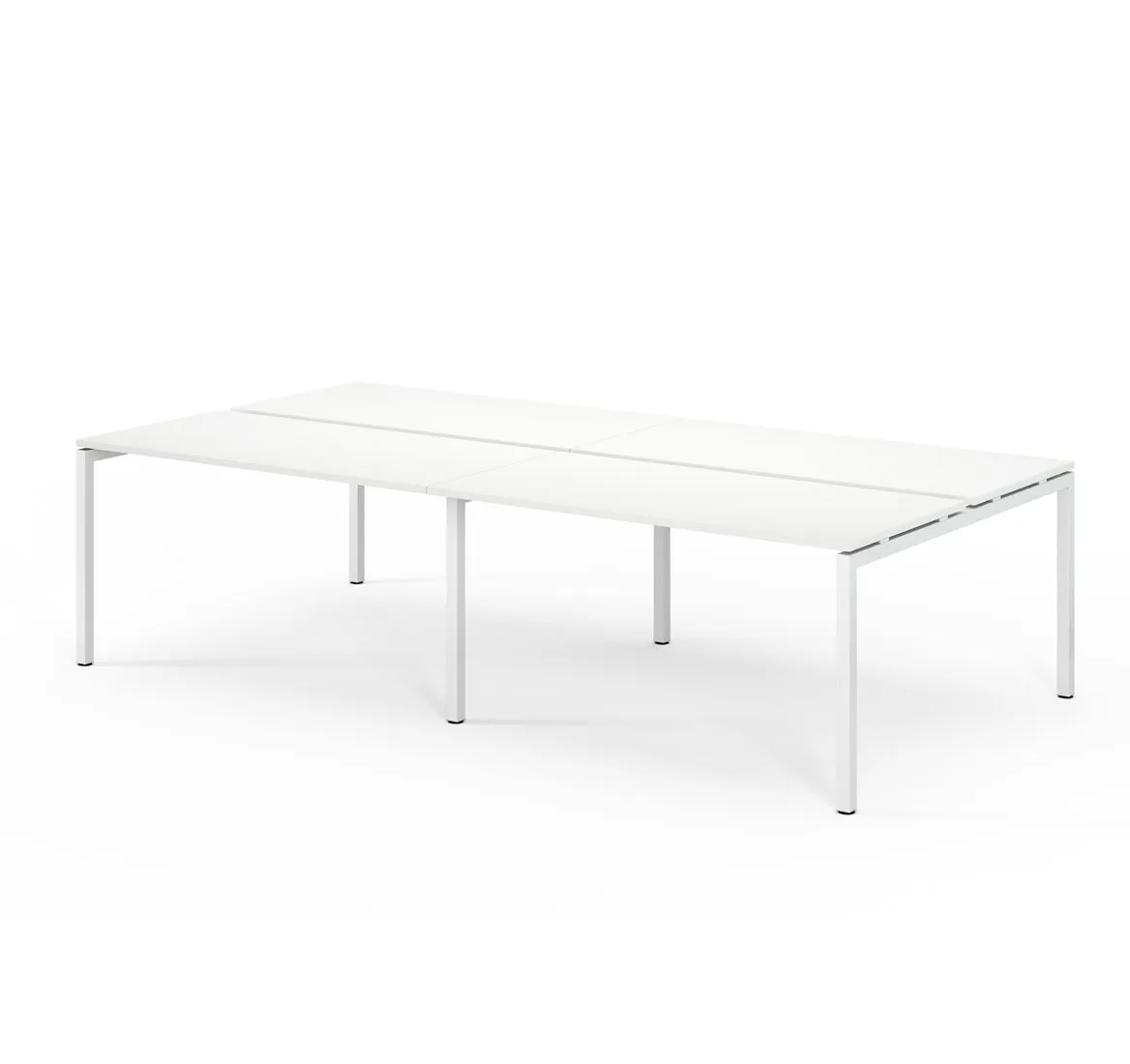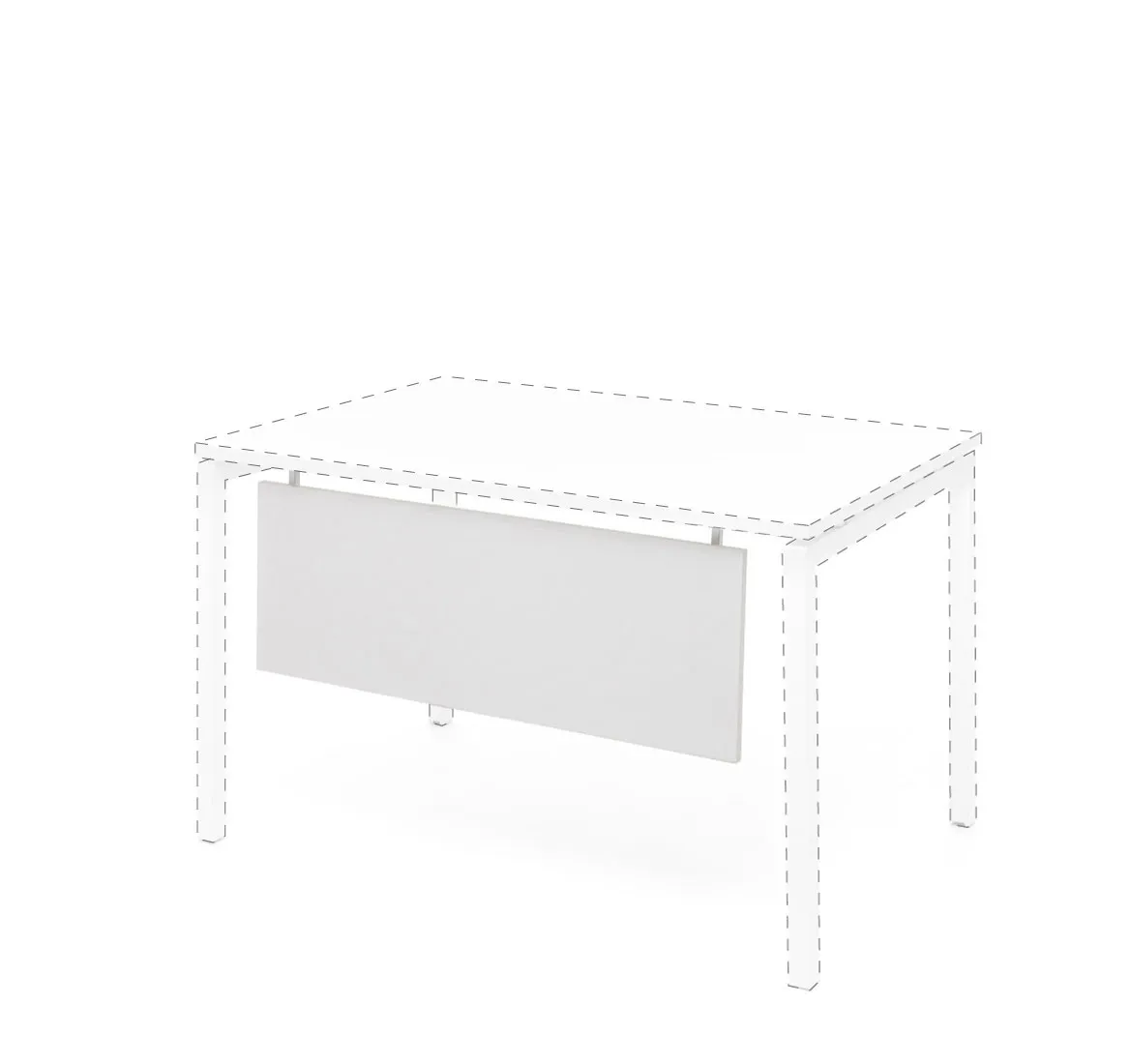 Между столешницей и поперечной частью П-образной опоры имеется металлическая вставка в цвете опоры, зазор между опорой и столешницей придает визуальную легкость конструкции. Столешница может быть дополнена передней панелью в белом цвете и фронтальными экранами ДСП или обитыми тканью.