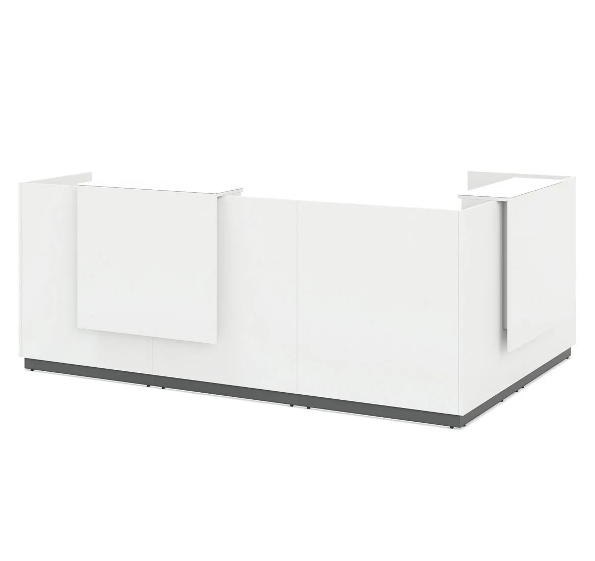 Модули стойки имеют цоколь, изготовленный из МДФ и облицованный прочным пластиком. Это делает нижнюю часть приемной стойки износостойкой и невосприимчивой к механическим (удары ботинками) и химическим (мытье полов моющими средствами) воздействиям.