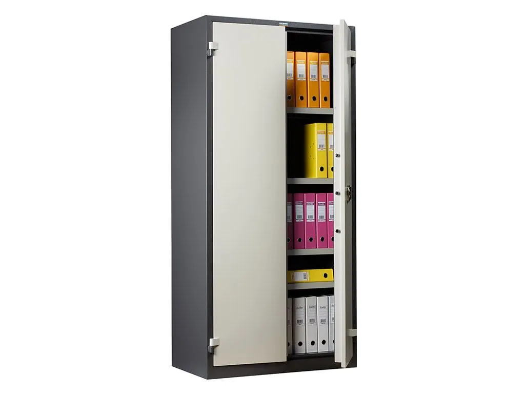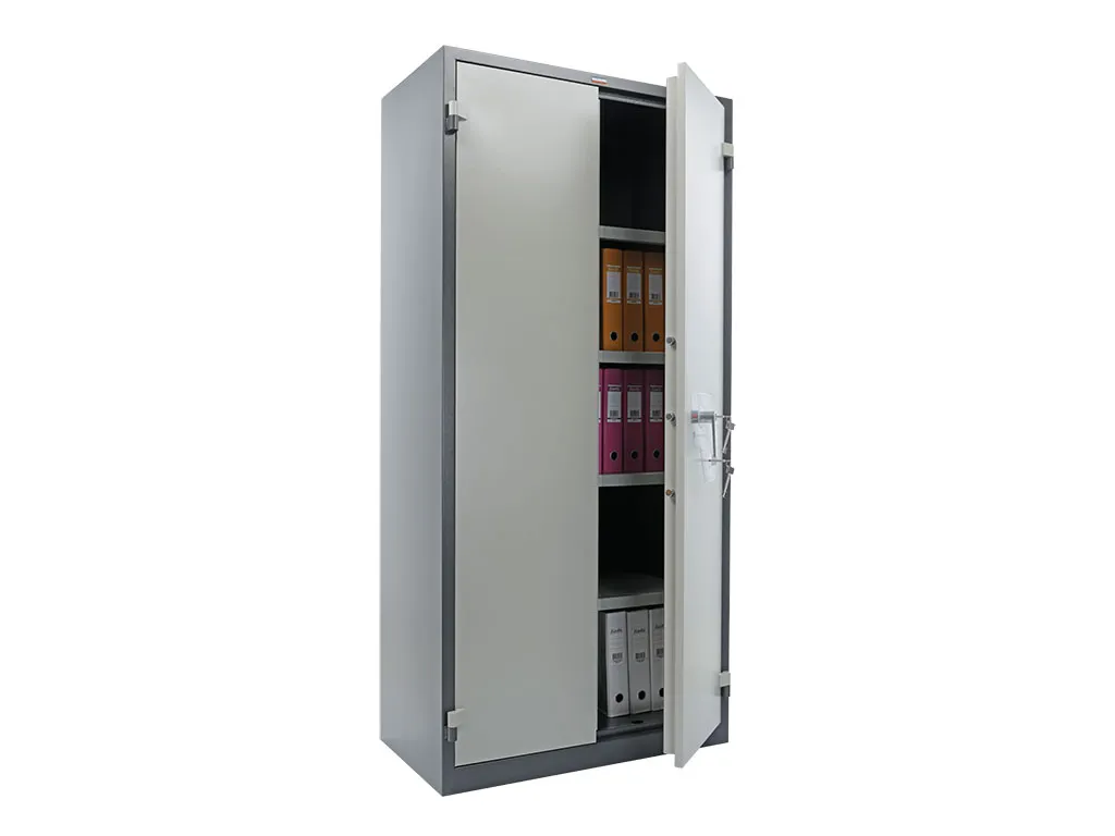 Классический вариант шкафа для офиса и архива – конструкция с распашными дверьми. В зависимости от уровня доступа к конфиденциальной информации, можно подобрать односекционный шкаф с одним или двумя замками или конструкцию, в которой для каждой полки есть отдельный замок.